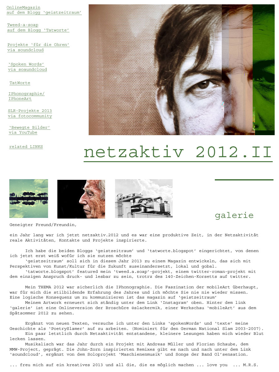 TICKER --- 01.02.2013 --- netzaktiv.2012. war und netzaktiv.2012.II. ist. Ich kann nur sagen, dass mir 2012 ungemein viel Spaß gemacht hat und mit der Entdeckung meiner Leidenschaft für mobileArt ein entscheidendes Jahr war. Virtuell wie real. ... Die Entwicklung und Ergebnisse der Projekte, sind auf dieser Seite zusammengetragen ... ... freue mich auf kreative Kommunikation und kreatives Tun ... ---- llG derSauer |